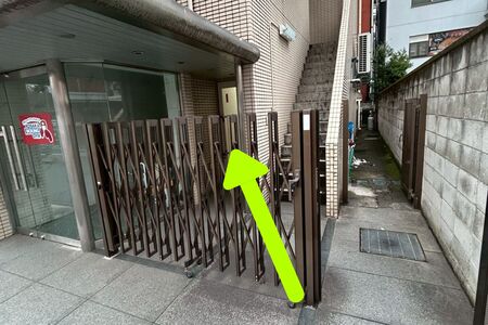 この扉から奥へ。エレベーターで4階に行き405号室にお入り下さい。