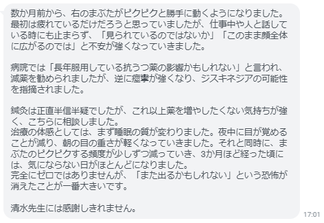 数か月前から、右のまぶたがピクピクと勝手に動くようになりました。最初は疲れているだけだろうと思っていましたが、仕事中や人と話している時にも止まらず、「見られているのではないか」「このまま顔全体に広がるのでは」と不安が強くなっていきました。病院では「長年服用している抗うつ薬の影響かもしれない」と言われ、減薬を勧められましたが、逆に痙攣が強くなり、ジスキネジアの可能性を指摘されました。鍼灸は正直半信半疑でしたが、これ以上薬を増やしたくない気持ちが強く、こちらに相談しました。治療の体感としては、まず睡眠の質が変わりました。夜中に目が覚めることが減り、朝の目の重さが軽くなっていきました。それと同時に、まぶたのピクピクする頻度が少しずつ減っていき、3か月ほど経った頃には、気にならない日がほとんどになりました。完全にゼロではありませんが、「また出るかもしれない」という恐怖が消えたことが一番大きいです。清水先生には感謝しきれません。