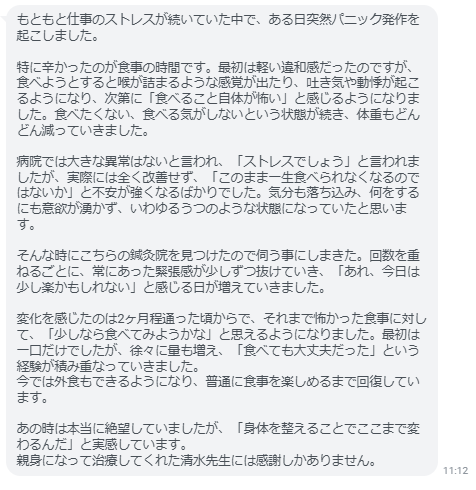 もともと仕事のストレスが続いていた中で、ある日突然パニック発作を起こしました。特に辛かったのが食事の時間です。最初は軽い違和感だったのですが、食べようとすると喉が詰まるような感覚が出たり、吐き気や動悸が起こるようになり、次第に「食べること自体が怖い」と感じるようになりました。食べたくない、食べる気がしないという状態が続き、体重もどんどん減っていきました。病院では大きな異常はないと言われ、「ストレスでしょう」と言われましたが、実際には全く改善せず、「このまま一生食べられなくなるのではないか」と不安が強くなるばかりでした。気分も落ち込み、何をするにも意欲が湧かず、いわゆるうつのような状態になっていたと思います。そんな時にこちらの鍼灸院を見つけたので伺う事にしまきた。回数を重ねるごとに、常にあった緊張感が少しずつ抜けていき、「あれ、今日は少し楽かもしれない」と感じる日が増えていきました。変化を感じたのは2ヶ月程通った頃からで、それまで怖かった食事に対して、「少しなら食べてみようかな」と思えるようになりました。最初は一口だけでしたが、徐々に量も増え、「食べても大丈夫だった」という経験が積み重なっていきました。今では外食もできるようになり、普通に食事を楽しめるまで回復しています。あの時は本当に絶望していましたが、「身体を整えることでここまで変わるんだ」と実感しています。親身になって治療してくれた清水先生には感謝しかありません。
