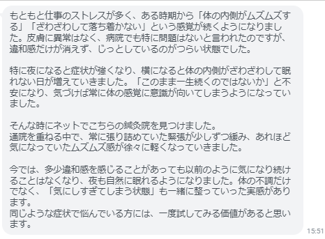もともと仕事のストレスが多く、ある時期から「体の内側がムズムズする」「ざわざわして落ち着かない」という感覚が続くようになりました。皮膚に異常はなく、病院でも特に問題はないと言われたのですが、違和感だけが消えず、じっとしているのがつらい状態でした。特に夜になると症状が強くなり、横になると体の内側がざわざわして眠れない日が増えていきました。「このまま一生続くのではないか」と不安になり、気づけば常に体の感覚に意識が向いてしまうようになっていました。そんな時にネットでこちらの鍼灸院を見つけました。通院を重ねる中で、常に張り詰めていた緊張が少しずつ緩み、あれほど気になっていたムズムズ感が徐々に軽くなっていきました。今では、多少違和感を感じることがあっても以前のように気になり続けることはなくなり、夜も自然に眠れるようになりました。体の不調だけでなく、「気にしすぎてしまう状態」も一緒に整っていった実感があります。同じような症状で悩んでいる方には、一度試してみる価値があると思います。