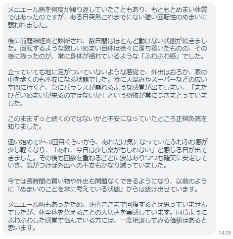 メニエール病を何度か繰り返していたこともあり、もともとめまい体質ではあったのですが、ある日突然これまでにない強い回転性のめまいに襲われました。後に前庭神経炎と診断され、数日間はほとんど動けない状態が続きました。回転するような激しいめまい自体は徐々に落ち着いたものの、その後に残ったのが、常に身体が揺れているような「ふわふわ感」でした。立っていても地に足がついていないような感覚で、外出はおろか、家の中を歩くのも不安になる状態でした。特に人混みやスーパーなどの広い空間に行くと、急にバランスが崩れるような感覚が出てしまい、「またひどいめまいが来るのではないか」という恐怖が常につきまとっていました。このままずっと続くのではないかと不安になっていたところ正鍼灸院を知りました。通い始めて2〜3回目くらいから、あれだけ気になっていたふわふわ感が少し軽くなり、「あれ、今日は少し楽かもしれない」と感じる日が出てきました。その後も回数を重ねるごとに波はありつつも確実に安定していき、気がつけば外出への不安もかなり減っていました。今では長時間の買い物や外出も問題なくできるようになり、以前のように「めまいのことを常に考えている状態」からは抜け出せています。メニエール病もあったため、正直ここまで回復するとは思っていませんでしたが、体全体を整えることの大切さを実感しています。同じようにふわふわした感覚で悩んでいる方には、一度相談してみる価値はあると思います。