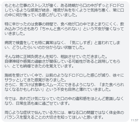 もともと仕事のストレスが強く、ある時期から口の中がずっとドロドロしているような感覚が続き、唾液が糸を引くようで気持ち悪く、常に口の中に何か残っている感じがしていました。特に辛かったのは食事の時間で、食べ物が口の中でまとまりにくく、飲み込みづらさもあり「ちゃんと食べられない」という不安が強くなっていきました。病院で検査をしても特に異常はなく、「気にしすぎ」と言われてしまい、どうしたらいいのか分からない状態でした。そんな時に正鍼灸院さんを知り、相談させていただきました。自律神経や感覚の過敏さが関係している可能性があると説明してもらい、とても納得できたのを覚えています。施術を受けていく中で、以前のようなドロドロした感じが減り、徐々にサラッとしてきた感覚がありました。さらに、気づけば食事もスムーズにできるようになり、「また食べられなくなるかもしれない」という不安も自然と薄れていきました。今では、あれだけ気になっていた口の中の違和感をほとんど意識しなくなり、日常生活も楽に過ごせています。同じような症状で悩んでいる方には、単なる口の問題ではなく体全体のバランスを整えることの大切さを知ってほしいと思います。