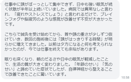 仕事中に頭がぼーっとして集中できず、日中も強い眠気が続く状態が半年以上続いていました。病院では異常なしと言われ、「疲れやストレスでしょう」と言われるだけで、ブレインフォグや脳疲労のような感覚が改善せず不安が大きかったです。こちらで鍼灸を受け始めてから、首や頭の重さが少しずつ抜けていき、数回の施術後には「頭がはっきりする時間」が明らかに増えてきました。以前は夕方になると何も考えられなかったのが、今では仕事を終えても余裕があります。眠りも深くなり、朝のだるさや日中の眠気が軽減したことで、生活の質が大きく変わりました。「年齢のせい」「気のせい」と諦めていた症状でしたが、自律神経から整えることで改善できたことに驚いています。