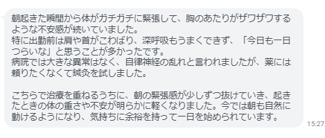 朝起きた瞬間から体がガチガチに緊張して、胸のあたりがザワザワするような不安感が続いていました。特に出勤前は肩や首がこわばり、深呼吸もうまくできず、「今日も一日つらいな」と思うことが多かったです。病院では大きな異常はなく、自律神経の乱れと言われましたが、薬には頼りたくなくて鍼灸を試しました。こちらで治療を重ねるうちに、朝の緊張感が少しずつ抜けていき、起きたときの体の重さや不安が明らかに軽くなりました。今では朝も自然に動けるようになり、気持ちに余裕を持って一日を始められています。