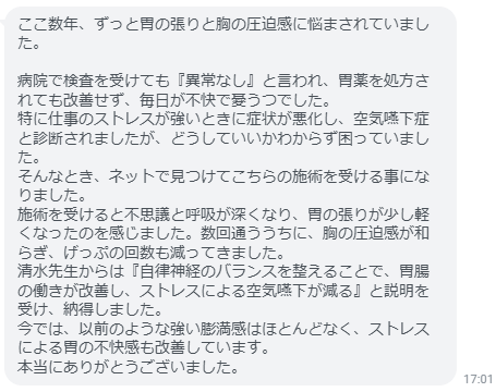 ここ数年、ずっと胃の張りと胸の圧迫感に悩まされていました。病院で検査を受けても『異常なし』と言われ、胃薬を処方されても改善せず、毎日が不快で憂うつでした。特に仕事のストレスが強いときに症状が悪化し、空気嚥下症と診断されましたが、どうしていいかわからず困っていました。そんなとき、ネットで見つけてこちらの施術を受ける事になりました。施術を受けると不思議と呼吸が深くなり、胃の張りが少し軽くなったのを感じました。数回通ううちに、胸の圧迫感が和らぎ、げっぷの回数も減ってきました。清水先生からは『自律神経のバランスを整えることで、胃腸の働きが改善し、ストレスによる空気嚥下が減る』と説明を受け、納得しました。今では、以前のような強い膨満感はほとんどなく、ストレスによる胃の不快感も改善しています。本当にありがとうございました。
