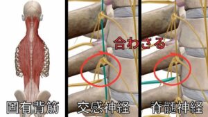 交感神経というのは脊柱の横を首から腰まで通っているのですが、それらの交感神経と固有背筋を支配している神経は吻合し(合わさり)脊髄へと入力されていきます。つまり、交感神経が支配している内臓の感覚や運動と固有背筋の感覚や運動が同調(シンクロ)するという事です。