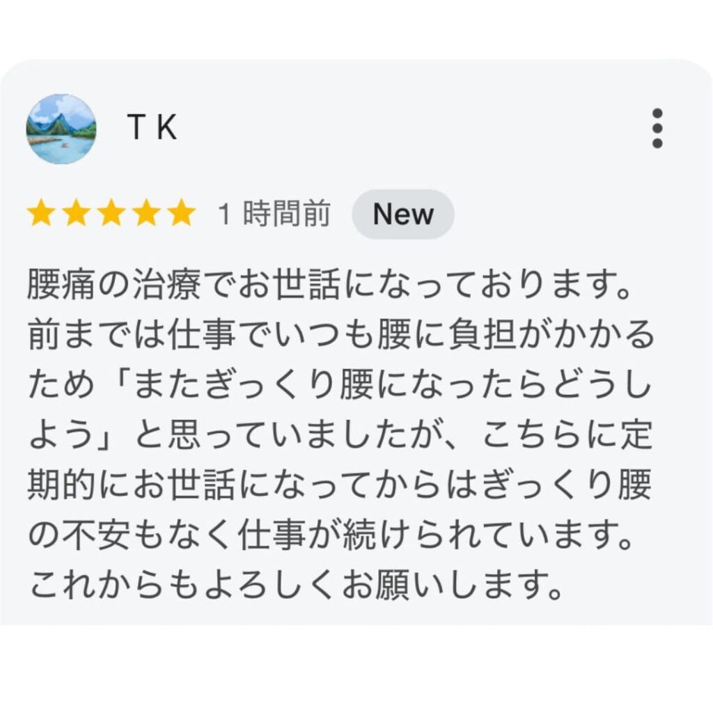 腰痛の治療でお世話になっております。前までは仕事でいつも腰に負担がかかるため「またぎっくり腰になったらどうしよう」と思っていましたが、こちらに定期的にお世話になってからはぎっくり腰の不安もなく仕事が続けられています。これからもよろしくお願いします。